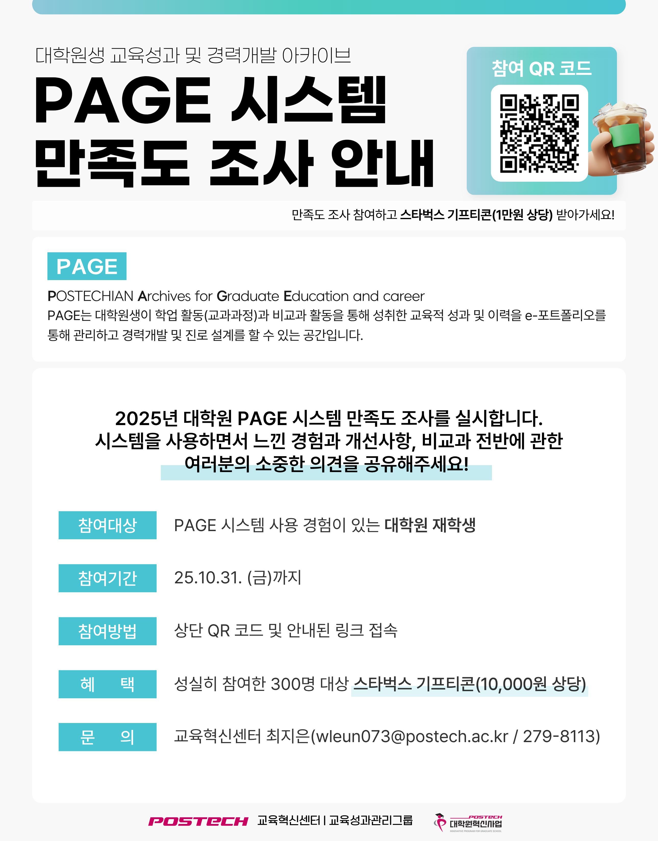 2025년도 POSTECH 대학원 PAGE 시스템 만족도 조사를 아래와 같이 실시하오니 많은 참여 바랍니다.