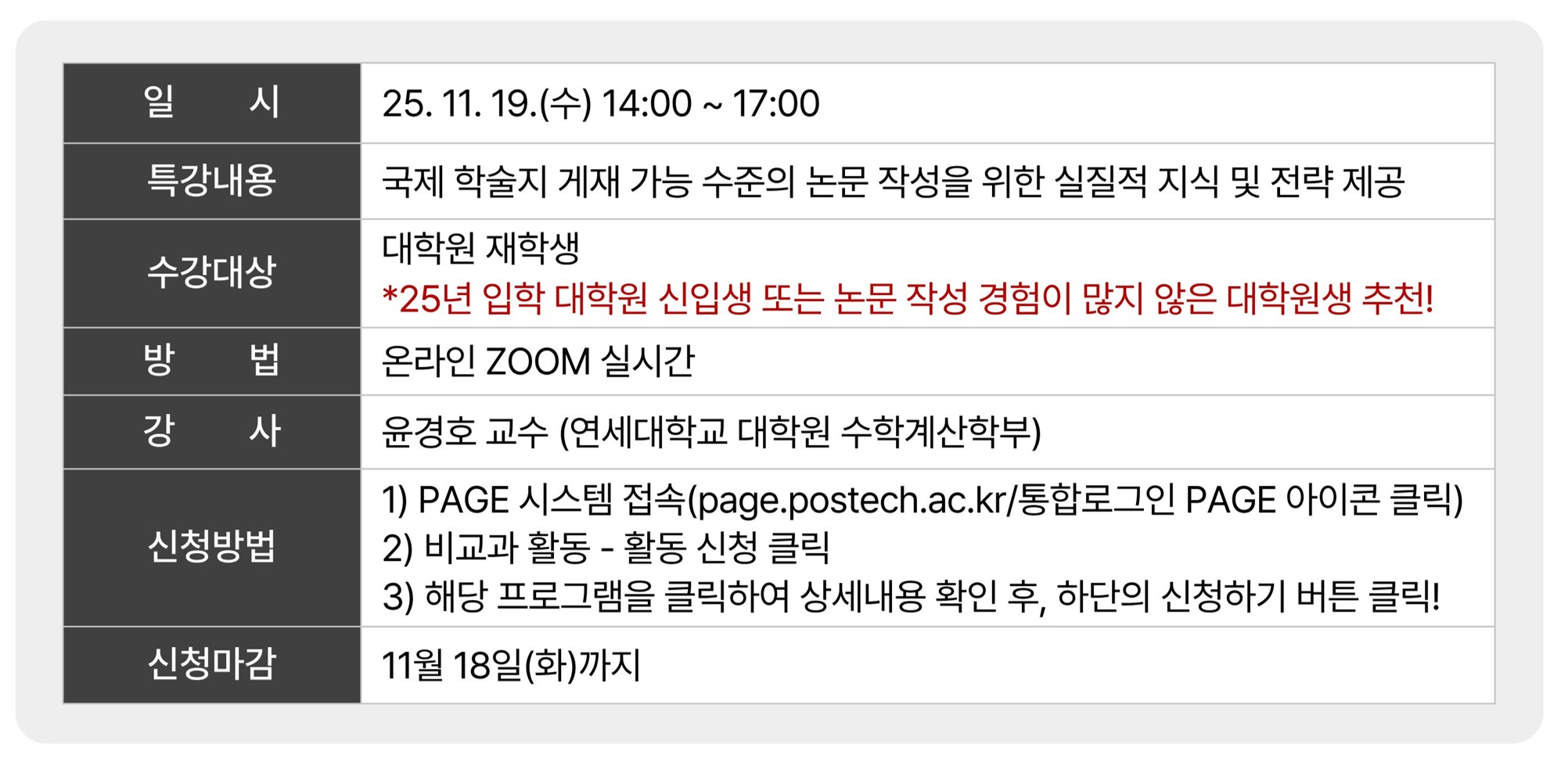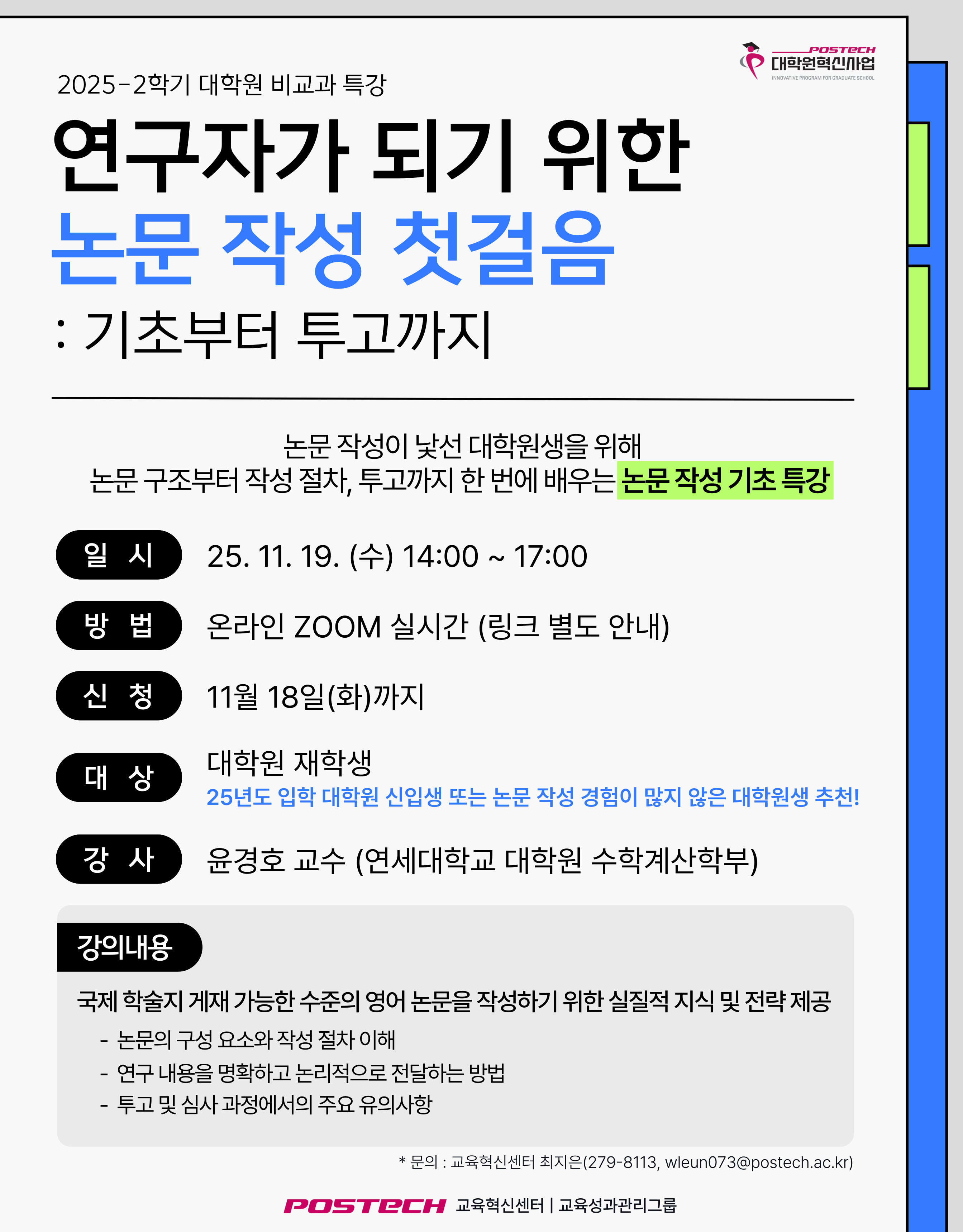 포스텍 교육혁신센터에서는 '연구자가 되기 위한 논문 작성 첫걸음 : 기초부터 투고까지' 특강을 운영하고자 하오니 많은 참여 바랍니다.