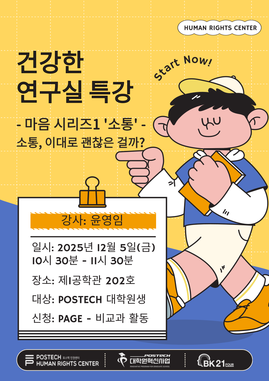 POSTECH 인권센터에서는 건강한 연구실 문화 조성을 위한 프로그램의 일환으로 학업과 연구, 진로, 대인관계 고민 등으로 마음이 지치고 어려움을 겪는 대학원생을 위한 특강을 마련하였습니다.