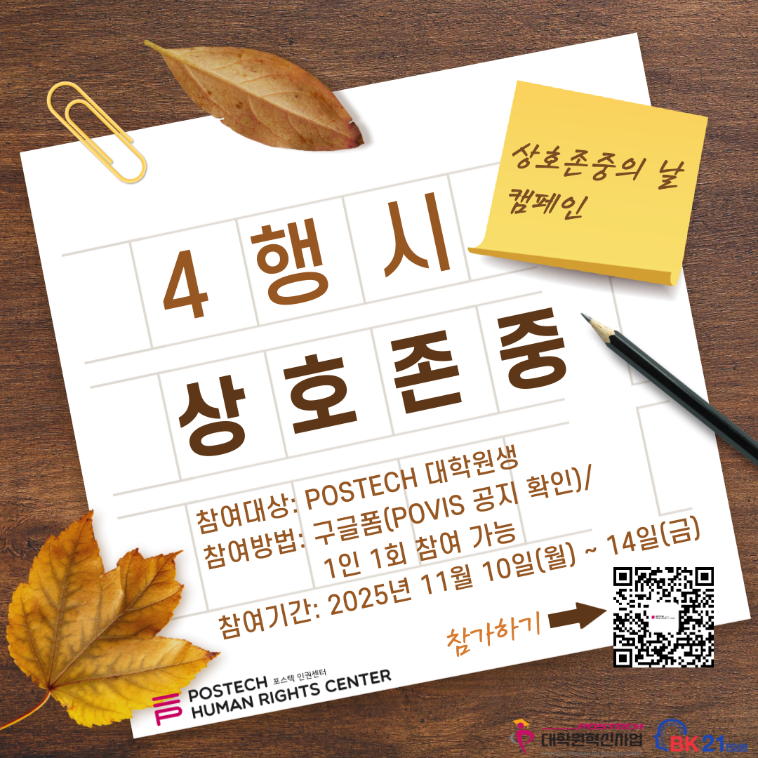 '상호존중의 날'을 맞아 지난 11월 10일(월)부터 14일(금)까지 진행된 상호존중의 날 캠페인 – 미니 공모전(3차)에 많은 관심과 참여를 보내주신 POSTECH 대학원생 여러분께 진심으로 감사드립니다.