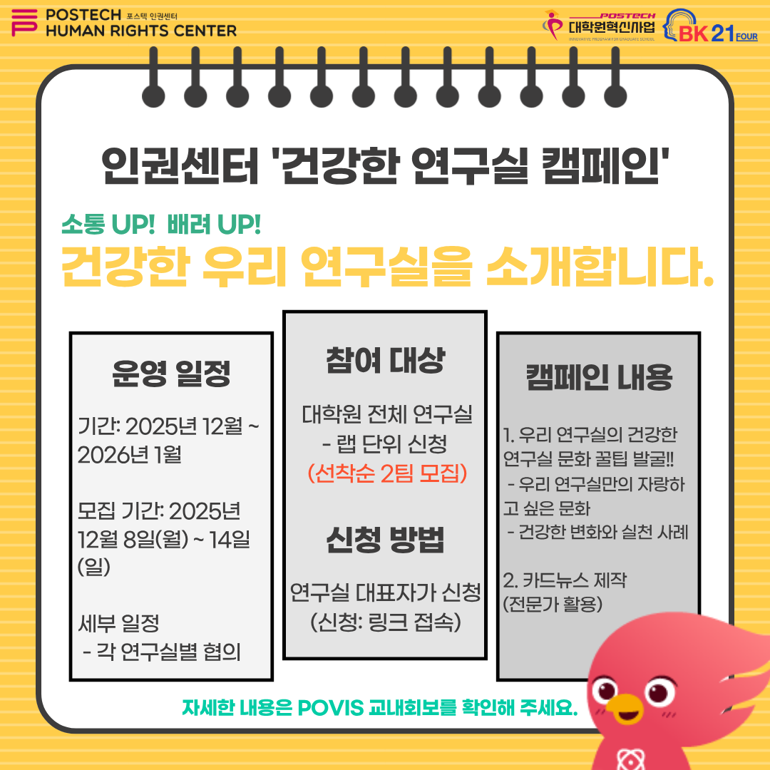 POSTECH 인권센터에서는 대학원생의 정서적 안정과 연구 환경을 개선하여 건강한 연구실 문화를 구축하기 위해 ‘건강한 연구실 캠페인’을 운영합니다.